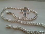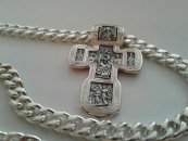 Изображено на кресте: Распятие Христово. Святая Троица. Святой Николай Чудотворец. Мученик Трифон. Три святителя. Икона Божией Матери "Толгская". Ангел Хранитель. Преподобный Сергий Радонежский. Святой Спиридон Тримифунский.1. Размер: 7 х 4 мм